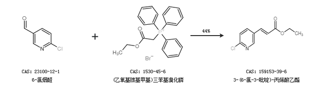 2.通过6-氯烟醛和(乙氧基羰基甲基)三苯基溴化膦合成3-(6-氯-3-吡啶)-丙烯酸乙酯,收率约44%;
