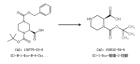 1.通过(S)-N-1-Boc-N-4-Cbz-2-哌嗪甲酸合成(S)-1-Boc-哌嗪-2-羧酸