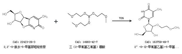 1.通过2,2''-O-脱水-5-甲基尿嘧啶核苷和三(2-甲氧基乙氧基)硼酸合成2’-O-(2-甲氧基乙基)-5-甲基尿苷,收率约70%;
