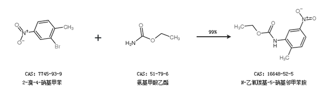 1.通过2-溴-4-硝基甲苯和氨基甲酸乙酯合成N-乙氧羰基-5-硝基邻甲苯胺,收率约99%;