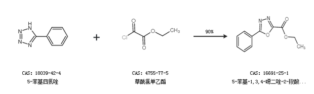 1.通过5-苯基四氮唑和草酰氯单乙酯合成5-苯基-1,3,4-噁二唑-2-羧酸乙酯,收率约90%;