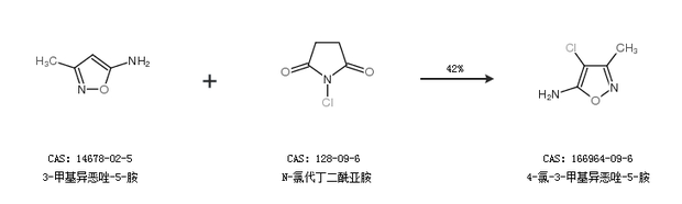 1.通过3-甲基异恶唑-5-胺和N-氯代丁二酰亚胺合成4-氯-3-甲基异恶唑-5-胺,收率约42%;