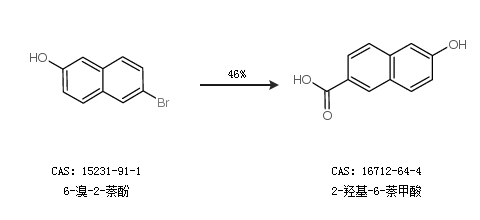 2.通过6-溴-2-萘酚合成2-羟基-6-萘甲酸,收率约46%;