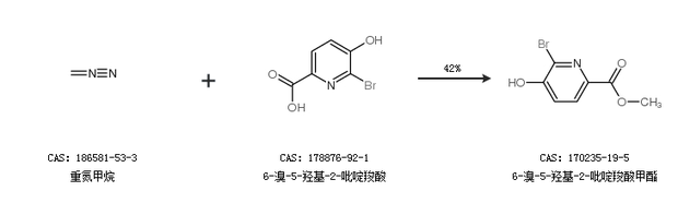 2.通过重氮甲烷和6-溴-5-羟基-2-吡啶羧酸合成6-溴-5-羟基-2-吡啶羧酸甲酯,收率约42%;