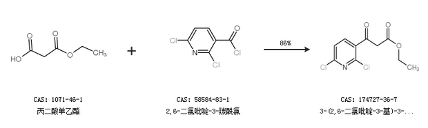 1.通过丙二酸单乙酯和2,6-二氯吡啶-3-羰酰氯合成3-(2,6-二氯吡啶-3-基)-3-氧代丙酸乙酯,收率约86%;