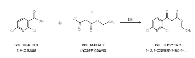2.通过2,6-二氯烟酸和丙二酸单乙酯钾盐合成3-(2,6-二氯吡啶-3-基)-3-氧代丙酸乙酯,收率约93%;