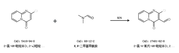 2.通过2-氯-4H-吡啶并[1,2-a]嘧啶-4-酮和N,N-二甲基甲酰胺合成2-氯-4-氧代-4H-吡啶并[1,2-a]嘧啶-3-甲醛,收率约92%;