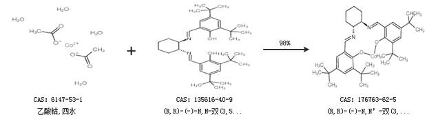 2.通过乙酸钴,四水和(R,R)-(-)-N,N-双(3,5-二叔丁亚水杨基)-1,2-环己烷合成(R,R)-(-)-N,N’-双(3,5-二叔丁基亚水杨基)-1,2-环己二胺钴(II),收率约98%;