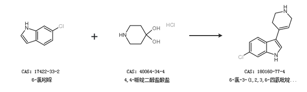 2.通过6-氯吲哚和4,4-哌啶二醇盐酸盐合成6-氯-3-(1,2,3,6-四氢吡啶-4-基)-1H-吲哚