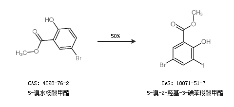 1.通过5-溴水杨酸甲酯合成5-溴-2-羟基-3-碘苯羧酸甲酯,收率约50%;