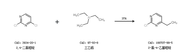 2.通过2,4-二氯嘧啶和三乙铝合成2-氯-4-乙基嘧啶,收率约37%;