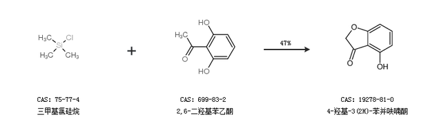 2.通过三甲基氯硅烷和2,6-二羟基苯乙酮合成4-羟基-3(2H)-苯并呋喃酮,收率约47%;