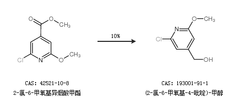 1.通过2-氯-6-甲氧基异烟酸甲酯合成(2-氯-6-甲氧基-4-吡啶)-甲醇,收率约10%;
