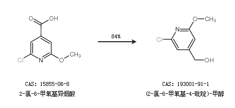 2.通过2-氯-6-甲氧基异烟酸合成(2-氯-6-甲氧基-4-吡啶)-甲醇,收率约84%;