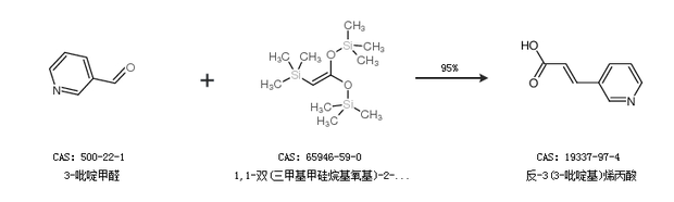 2.通过3-吡啶甲醛和1,1-双(三甲基甲硅烷基氧基)-2-三甲基甲硅烷基乙烯合成反-3(3-吡啶基)烯丙酸,收率约95%;