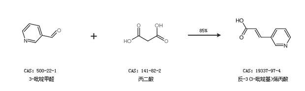 1.通过3-吡啶甲醛和丙二酸合成反-3(3-吡啶基)烯丙酸,收率约85%;