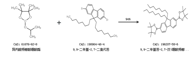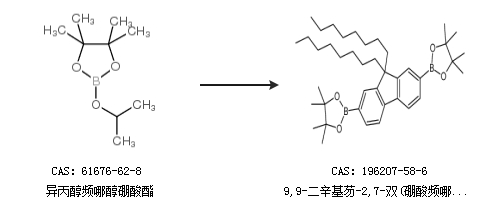 中文别名 2,7-双(4,4,5,5-四甲基-1,3,2-二氧杂戊硼环-2-基)-9,9-二正辛基芴;2,7-二(4,4,5,5-四甲基-1,3-二氧-2-硼烷基)-9,9-二辛基芴;9,9-二正辛基芴-2,7-二硼酸二频哪酯;9,9-二辛基芴-2,7-二硼酸频哪醇酯;