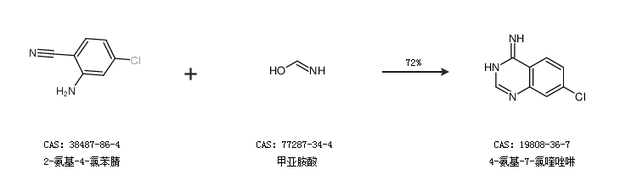 1.通过2-氨基-4-氯苯腈和甲亚胺酸合成4-氨基-7-氯喹唑啉,收率约72%;