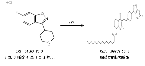 1.通过6-氟-3-哌啶-4-基-1,2-苯并异唑盐酸盐合成帕潘立酮棕榈酸酯,收率约77%;