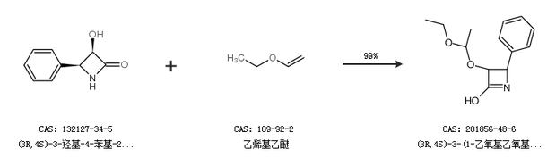 1.通过(3R,4S)-3-羟基-4-苯基-2-氮杂环丁酮和乙烯基乙醚合成(3R,4S)-3-(1-乙氧基乙氧基)-4-苯基-2-氮杂环丁酮,收率约99%;