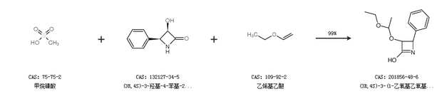 2.通过甲烷磺酸、(3R,4S)-3-羟基-4-苯基-2-氮杂环丁酮和乙烯基乙醚合成(3R,4S)-3-(1-乙氧基乙氧基)-4-苯基-2-氮杂环丁酮,收率约99%;