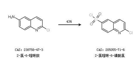 1.通过2-氯-6-喹啉胺合成2-氯喹啉-6-磺酰氯,收率约43%;