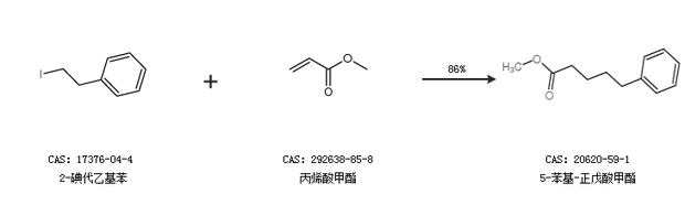 2.通过2-碘代乙基苯和丙烯酸甲酯合成5-苯基-正戊酸甲酯,收率约86%;