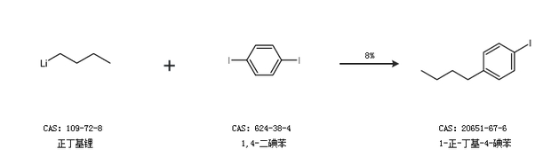 1.通过正丁基锂和1,4-二碘苯合成1-正-丁基-4-碘苯,收率约8%;