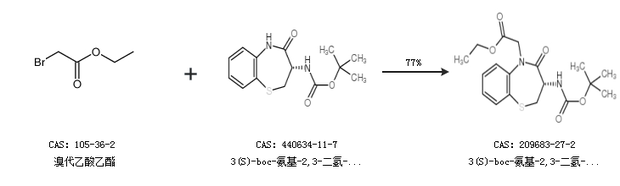 1.通过溴代乙酸乙酯和3(S)-boc-氨基-2,3-二氢-4-氧代-1,5-苯并噻杂烷合成3(S)-boc-氨基-2,3-二氢-4-氧代-1,5-苯并噻杂烷-5(2h)-乙酸乙酯,收率约77%;