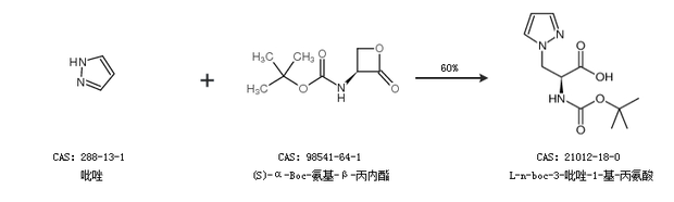 1.通过吡唑和(S)-α-Boc-氨基-β-丙内酯合成L-n-boc-3-吡唑-1-基-丙氨酸,收率约60%;