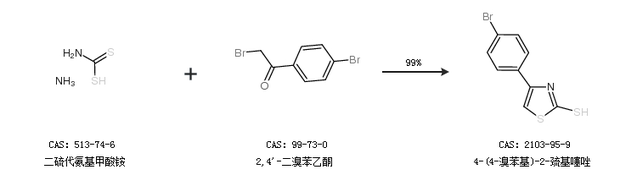 1.通过二硫代氨基甲酸铵和2,4''-二溴苯乙酮合成4-(4-溴苯基)-2-巯基噻唑,收率约99%;
