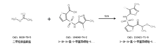 1.通过二甲羟胺盐酸盐和3-(N-(4-氯-3-甲基异噁唑-5-基)磺酰基)噻吩-2-羧酸合成3-(N-(4-氯-3-甲基异噁唑-5-基)磺酰基)-n-甲氧基-n-甲基噻吩-2-羧酰胺,收率约51%;
