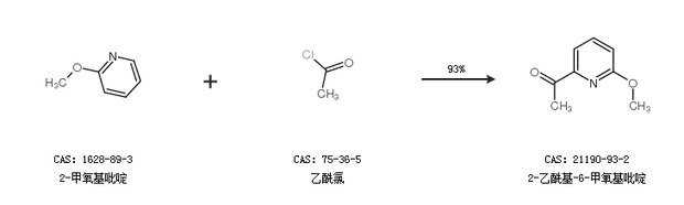 1.通过2-甲氧基吡啶和乙酰氯合成2-乙酰基-6-甲氧基吡啶,收率约93%;