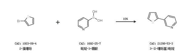 1.通过2-溴噻吩和吡啶-3-硼酸合成3-(2-噻吩基)吡啶,收率约10%;