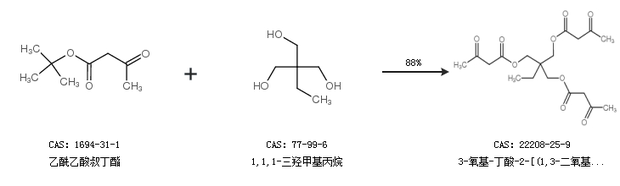 1.通过乙酰乙酸叔丁酯和1,1,1-三羟甲基丙烷合成3-氧基-丁酸-2-[(1,3-二氧基丁氧基)甲基]-2-乙基1,3-丙二基酯,收率约88%;