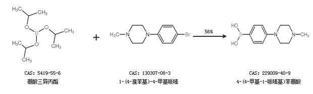 1.通过硼酸三异丙酯和1-(4-溴苯基)-4-甲基哌嗪合成4-(4-甲基-1-哌嗪基)苯硼酸,收率约56%;