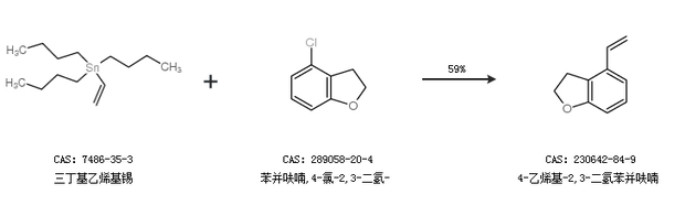 1.通过三丁基乙烯基锡和苯并呋喃,4-氯-2,3-二氢-合成4-乙烯基-2,3-二氢苯并呋喃,收率约59%;