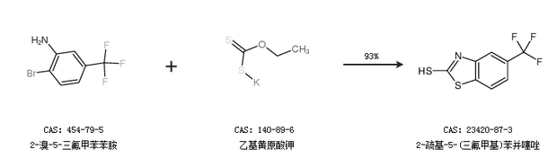 1.通过2-溴-5-三氟甲苯苯胺和乙基黄原酸钾合成2-疏基-5-(三氟甲基)苯并噻唑,收率约93%;