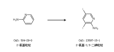 1.通过2-氨基吡啶合成2-氨基-3,5-二碘吡啶,收率约11%;