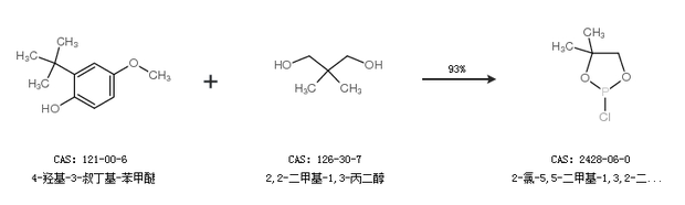 2.通过4-羟基-3-叔丁基-苯甲醚和2,2-二甲基-1,3-丙二醇合成2-氯-5,5-二甲基-1,3,2-二氧磷杂环己烷,收率约93%;