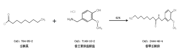 2.通过壬酰氯和香兰素胺盐酸盐合成香草壬酰胺,收率约62%;