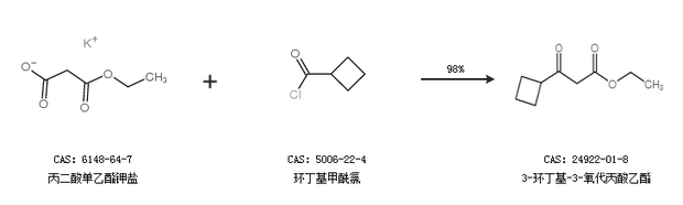 1.通过丙二酸单乙酯钾盐和环丁基甲酰氯合成3-环丁基-3-氧代丙酸乙酯,收率约98%;