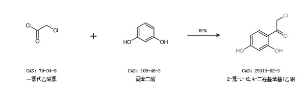 2.通过一氯代乙酰氯和间苯二酚合成2-氯-1-(2,4-二羟基苯基)乙酮,收率约62%;
