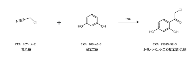 1.通过氯乙腈和间苯二酚合成2-氯-1-(2,4-二羟基苯基)乙酮,收率约39%;