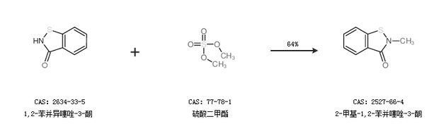 1.通过1,2-苯并异噻唑-3-酮和硫酸二甲酯合成2-甲基-1,2-苯并噻唑-3-酮,收率约64%;