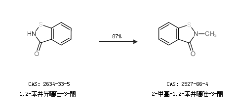 2.通过1,2-苯并异噻唑-3-酮合成2-甲基-1,2-苯并噻唑-3-酮,收率约87%;