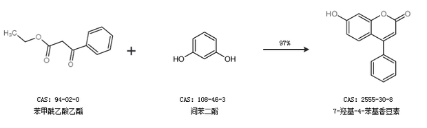 1.通过苯甲酰乙酸乙酯和间苯二酚合成7-羟基-4-苯基香豆素,收率约97%;