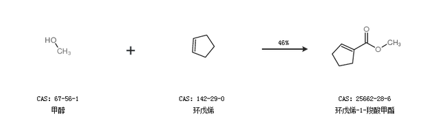 1.通过甲醇和环戊烯合成环戊烯-1-羧酸甲酯,收率约46%;