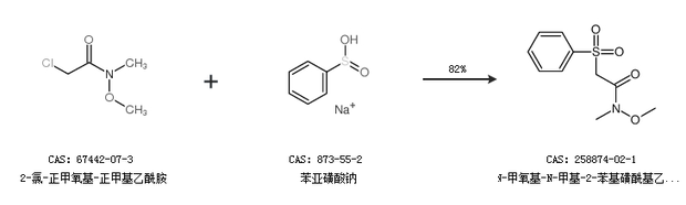 1.通过2-氯-正甲氧基-正甲基乙酰胺和苯亚磺酸钠合成N-甲氧基-N-甲基-2-苯基磺酰基乙酰胺,收率约82%;
