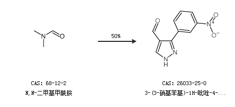 1.通过N,N-二甲基甲酰胺合成3-(3-硝基苯基)-1H-吡唑-4-甲醛,收率约50%;